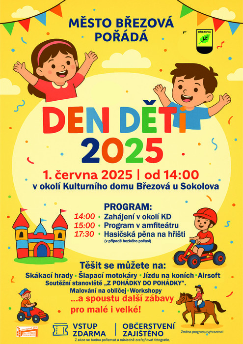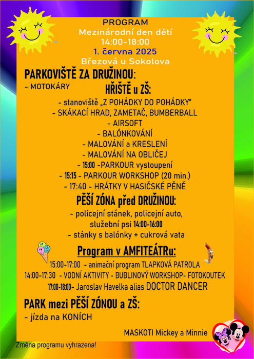 1: HŘIŠTĚ, PĚŠÍ ZÓNA U ZŠ14:00 - 17:30 - STEZKA SOUTĚŽÍ Z POHÁDKY DO POHÁDKY, MALOVÁNÍ NEJEN NA NA OBLIČEJ, JÍZDA NA KONÍCH, SKÁKACÍ HRADY, NĚJAKÝ WORKSHOP, AIRSOFT .... 17:40 - HASIČSKÁ PĚNA (v případě hezkého počasí). 2: PARKOVIŠTĚ ZA DRUŽINOU 14:00 - MOTOKÁRY. 3: V AMFITEÁTRU u KD OD 15:00 - ANIMAČNÍ PROGRAM, FOTOKOUTEK. vstupné zdarma. Občerstvení zajištěno.