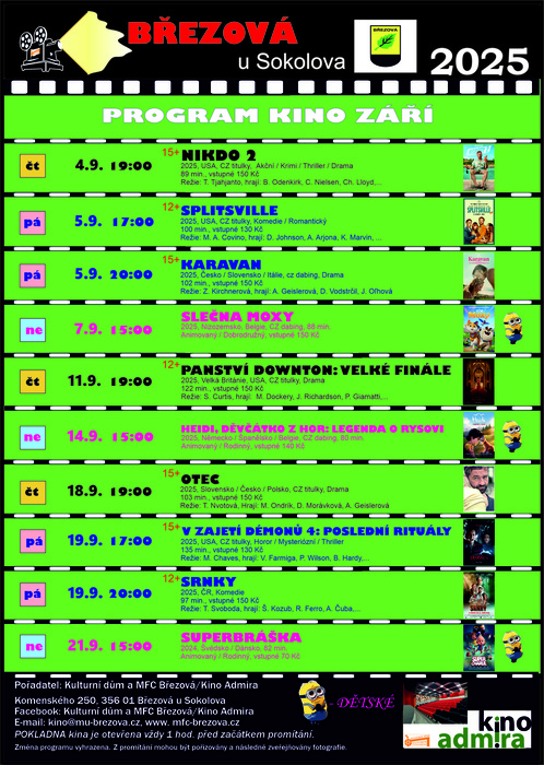 Úvod > Město Březová > Novinky > Program kina Admira na ZÁŘÍ 2025